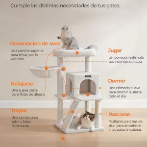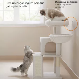 Rampa de Rascado 2 en 1: Este árbol para gatos incluye una práctica rampa que funciona tanto como tablero de rascado como escalera. Esto facilita el acceso para gatitos, gatos mayores o aquellos con problemas de movilidad, mientras satisface su necesidad de rascar.