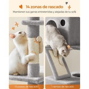Zonas de Rascado Integradas: Con 13 postes y 1 rampa de rascado en cada nivel, este árbol permite a los gatos satisfacer sus instintos naturales de rascado, protegiendo así tu sofá.