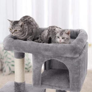 El árbol incluye dos casetas de juego, creando escondites perfectos y lugares acogedores para dormir. Es ideal para gatos activos que disfrutan de tener su propio espacio privado.