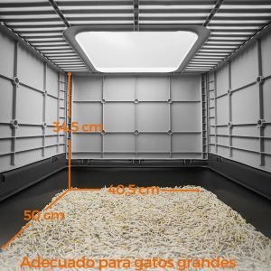 Con dimensiones interiores de 50 x 40,5 x 34,5 cm, ofrece amplio espacio para gatos de mayor tamaño, garantizando que incluso los felinos más grandes o robustos encuentren su lugar cómodo para hacer sus necesidades. La parte superior es resistente, soportando hasta 15 kg, adecuada para gatos de todos los tamaños.