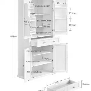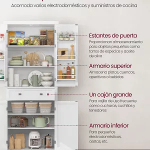 Gran capacidad: Equipado con 2 grandes armarios, un amplio cajón extraíble y 6 estantes en la puerta, este espacioso armario de despensa ofrece un amplio espacio para almacenar todo tipo de objetos, desde alimentos y vajilla hasta electrodomésticos, manteniendo cualquier habitación ordenada y organizada.