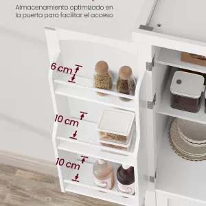 Estantes en la puerta: Los 6 estantes de la puerta, con una profundidad de 6 cm en los dos superiores y 10 cm en los cuatro inferiores, maximizan el espacio de almacenamiento. Cada estante puede soportar hasta 4,5 kg, facilitando la búsqueda y el acceso a objetos pequeños como especias, utensilios o accesorios de cocina.