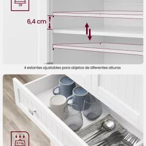 Estantes ajustables: Este armario de cocina cuenta con 4 estantes ajustables en 3 alturas diferentes, permitiendo almacenar objetos de diversas dimensiones como libros, organizadores o zapatos de tacón. Cada estante ajustable soporta hasta 27 kg, ofreciendo una flexibilidad excepcional para adaptarse a tus necesidades de almacenamiento.