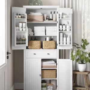 Estable, duradero y seguro: Fabricado con MDF de alta calidad y equipado con 3 bisagras para apoyar cada puerta del armario superior, este armario alto es resistente y duradero, garantizando un uso a largo plazo. Además, el dispositivo de fijación permite fijar el armario a la pared, aumentando su estabilidad y seguridad, especialmente en hogares con niños o mascotas.