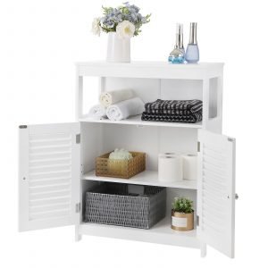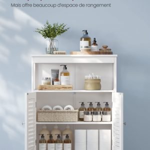Amplio Espacio de Almacenamiento: Con un compartimento abierto en la parte superior y un compartimento cerrado con 2 puertas laminadas y estantes regulables (3 alturas disponibles), este armario proporciona mucho espacio. Perfecto como armario de baño, zapatero, consola o armario de almacenamiento.