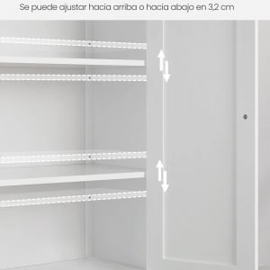Diseño Flexible con Baldas Ajustables: Con 2 baldas ajustables y agujeros previstos, el armario de dos puertas proporciona un espacio de diseño flexible con 3 niveles de estanterías divididas en 3 compartimentos. Ideal para organizar y guardar objetos diversos.
