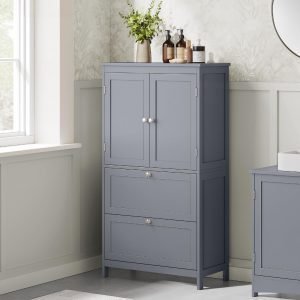 Armario de baño con 2 cajones y 2 puertas, estante ajustable, gris paloma