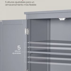 Este armario se destaca por su estante ajustable en 5 posiciones detrás de la puerta, lo que te permite organizar objetos de diversas alturas según tus necesidades. La flexibilidad de este diseño te asegura un uso eficiente del espacio disponible.