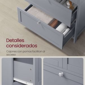 Pensando en tu comodidad, el diseño del gabinete superior y los cajones inferiores facilita el acceso y la visibilidad de tus artículos sin necesidad de agacharte. Además, los cajones cuentan con correderas suaves para un manejo fácil y cómodo.