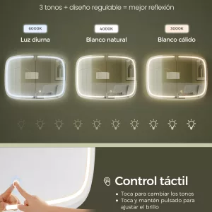 Control Táctil con Luz LED Ajustable: Este espejo de baño cuenta con iluminación LED integrada, que se controla fácilmente a través de un sensor táctil. Cambia entre tres temperaturas de color (blanco frío, blanco cálido y luz diurna) y ajusta el brillo según tus necesidades. Es la herramienta perfecta para maquillarte, afeitarte o realizar otras tareas de cuidado personal con una iluminación óptima.