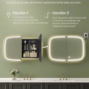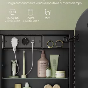Estación de Carga Incorporada: Mantén tus dispositivos siempre cargados y a mano. Este espejo cuenta con una regleta de alimentación integrada que incluye 2 tomas de corriente CA y 2 puertos USB-A, ideal para cargar afeitadoras, cepillos de dientes eléctricos y otros dispositivos, sin necesidad de ocupar enchufes adicionales en el baño.