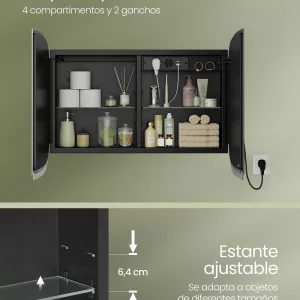 Almacenamiento Ajustable: Detrás de las puertas del espejo, encontrarás 2 estantes ajustables en 3 alturas diferentes. Este diseño versátil permite organizar y almacenar fácilmente artículos de tocador de diversos tamaños, desde lociones y fragancias altas hasta cremas y cosméticos más pequeños.