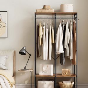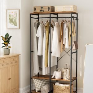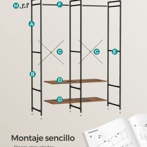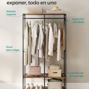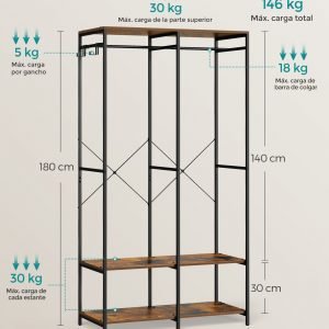 Este ropero no solo es elegante, sino también increíblemente duradero. Construido con una estructura metálica resistente y paneles de aglomerado de alta calidad, y reforzado con barras en X en la parte posterior, está diseñado para soportar hasta 146 kg. Es la solución perfecta para almacenar desde tus prendas más ligeras hasta las chaquetas de invierno más pesadas sin esfuerzo.