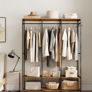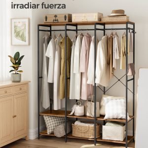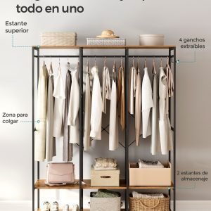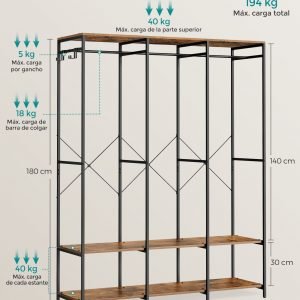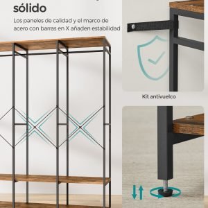 Armario ropa portátil plegable, barras colgar, estantes, marrón
