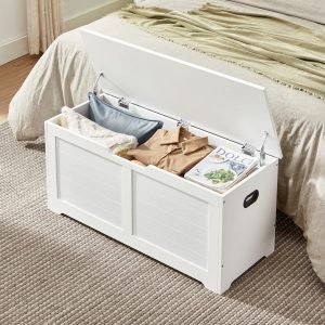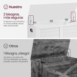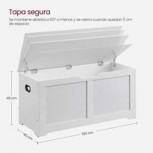 Banco de almacenaje estilo rústico con bisagras de seguridad, blanco mate