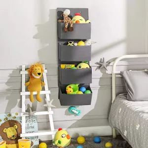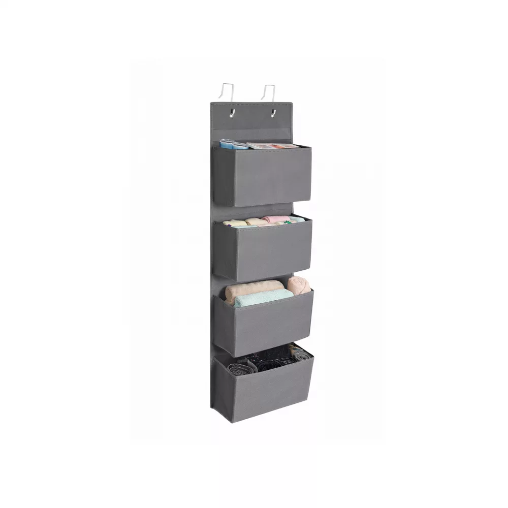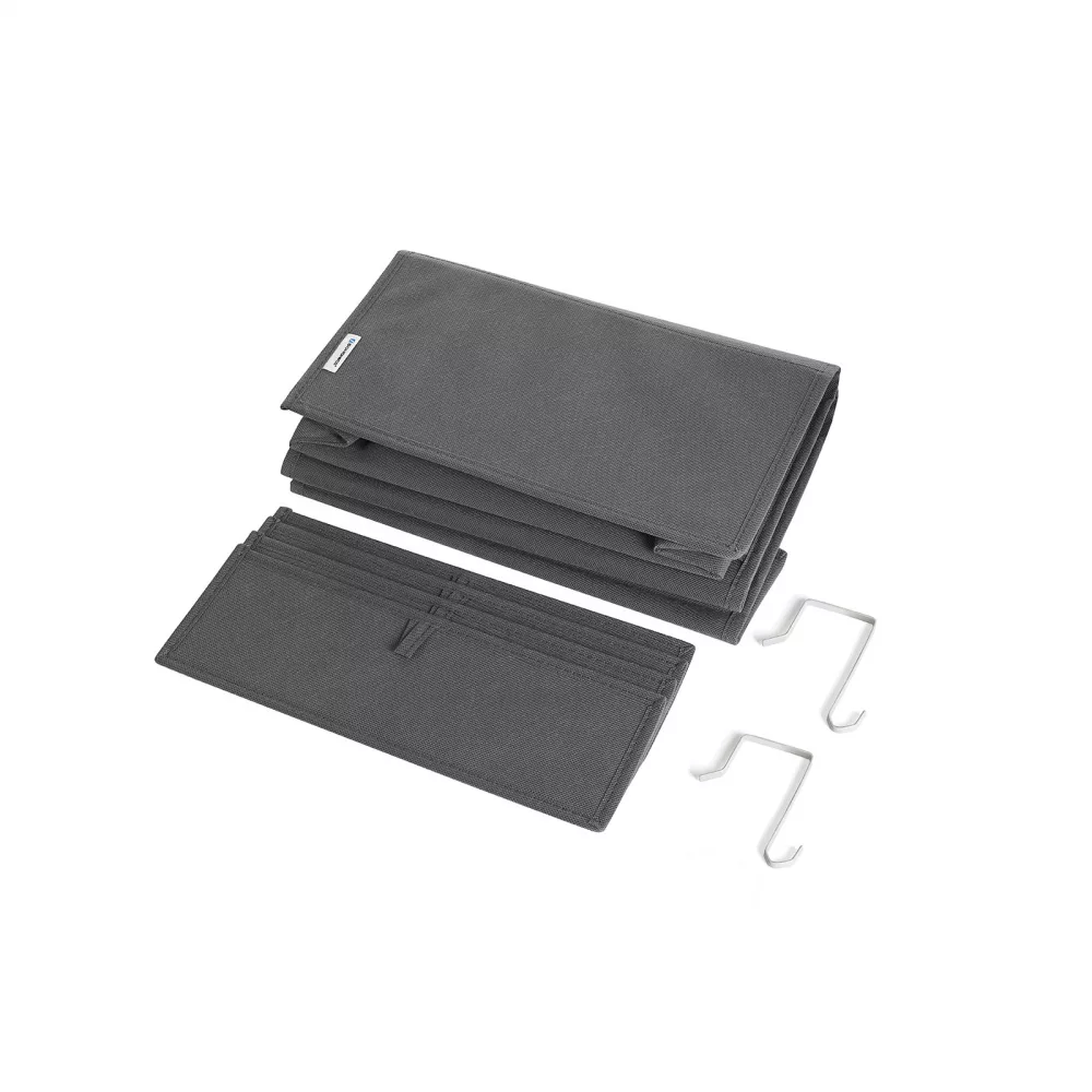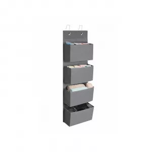 Si los objetos importantes siempre están ocultos en cajones oscuros o en las esquinas del armario, ¿por qué no los cuelga? Este organizador de puertas 33,5 x 12 x 100 cm (Largo x Ancho x Alto) los tiene siempre a mano cuando es necesario. ¿Dónde se puede utilizar?Gracias a su cubierta de tela de 80 g/㎡ y a su grueso interior de cartón, la unidad de almacenamiento colgante con 4 grandes bolsillos se puede utilizar para guardar juguetes, ropa de cama o cualquier otra cosa que desees agarrar a la vez. Todo para Tu ConvenienciaLa vida no debe ser compleja, así que hemos diseñado este organizador de almacenamiento colgante con 7 cm entre cada bolsillo para facilitar el acceso y el almacenamiento fácil de tus objetos. Además, puedes colgar este ligero organizador en la puerta en pocos segundos gracias a los ganchos de hierro. Además, puedes plegarlo cuando no lo utilices sin ocupar espacio. Especificaciones:- Color: Gris- Material: 80 g/㎡ Tela no tejida, Cartón, Gancho de hierro- Tamaño total: 33.5 x 12 x 100 cm (Largo x Ancho x Alto)- Dimensiones de cada bolsillo:Longitud: 32 cmAltura: 17 cmProfundidad: 10 cm (Parte inferior), 11 cm (Parte superior)- Peso del producto: 900 g- Máx. Capacidad de carga estática total: 5 kgContenidos del paquete:- 1 x Bolsa colgante de puerta- 4 x Placa base- 2 x GanchoNotas:- Por favor, no pongas objetos con sobrepeso sobre ella.- Es un producto no lavable; si hay una mancha en la superficie, límpiela con un paño húmedo.