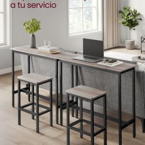 Imagina comenzar el día en un espacio diseñado especialmente para disfrutar de los momentos más placenteros, con una mesa alta de 100 x 40 cm perfecta para compartir café, croissants, y zumo. Los taburetes, de 30 x 40 cm, ofrecen el asiento cómodo ideal para dos, haciendo de este conjunto la adición perfecta para cualquier cocina o área pequeña.