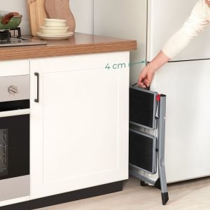 Descubre la escalera plegable de dos niveles, la solución perfecta para alcanzar esos lugares difíciles en tu hogar. Fabricada en acero resistente, esta escalera soporta hasta 150 kg, brindándote la estabilidad y seguridad necesarias para realizar tus tareas sin preocupaciones. Su diseño inteligente te permite concentrarte plenamente en lo que estás haciendo, ya sea cambiar una bombilla o alcanzar libros en el estante más alto.