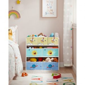 Esta estantería no solo es funcional, sino también un elemento decorativo. Sus colores vivos y los divertidos motivos del espacio, el sol y el cohete, crean un ambiente alegre y estimulante, ideal para cualquier habitación infantil.