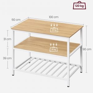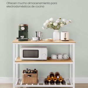 - Almacenamiento de Tres Niveles: Ofrece una organización eficiente con su estantería de tres niveles, perfecta para colocar una variedad de artículos desde teteras y electrodomésticos hasta cajas y utensilios.