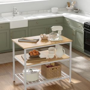 Esta isla de cocina no solo es una solución práctica para tus necesidades de preparación de alimentos y almacenamiento, sino también una elegante adición a tu cocina. Su diseño funcional y estético la convierte en una pieza central ideal para cocinas modernas, proporcionando comodidad y eficiencia en tu espacio culinario.