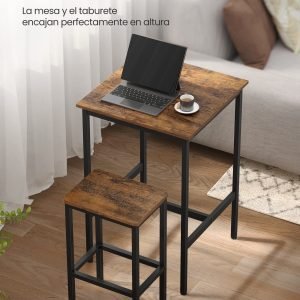 Si buscas un mueble multifuncional que se adapte a varios espacios y necesidades, ¡aquí lo tienes! Este conjunto de mesa y taburetes es ideal tanto para comenzar el día con un desayuno acogedor en la cocina, disfrutar de una copa de vino por la noche, o montar un práctico espacio de trabajo en casa.