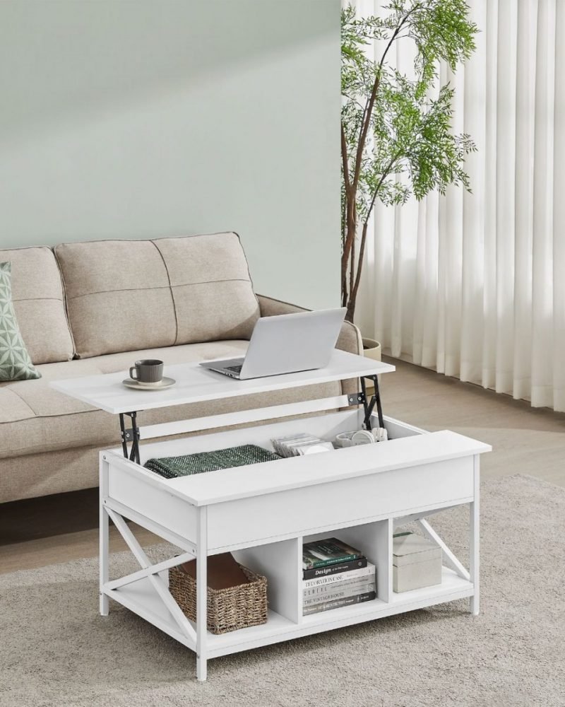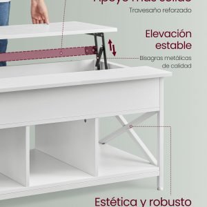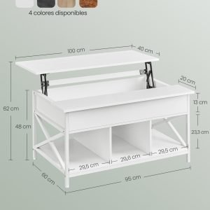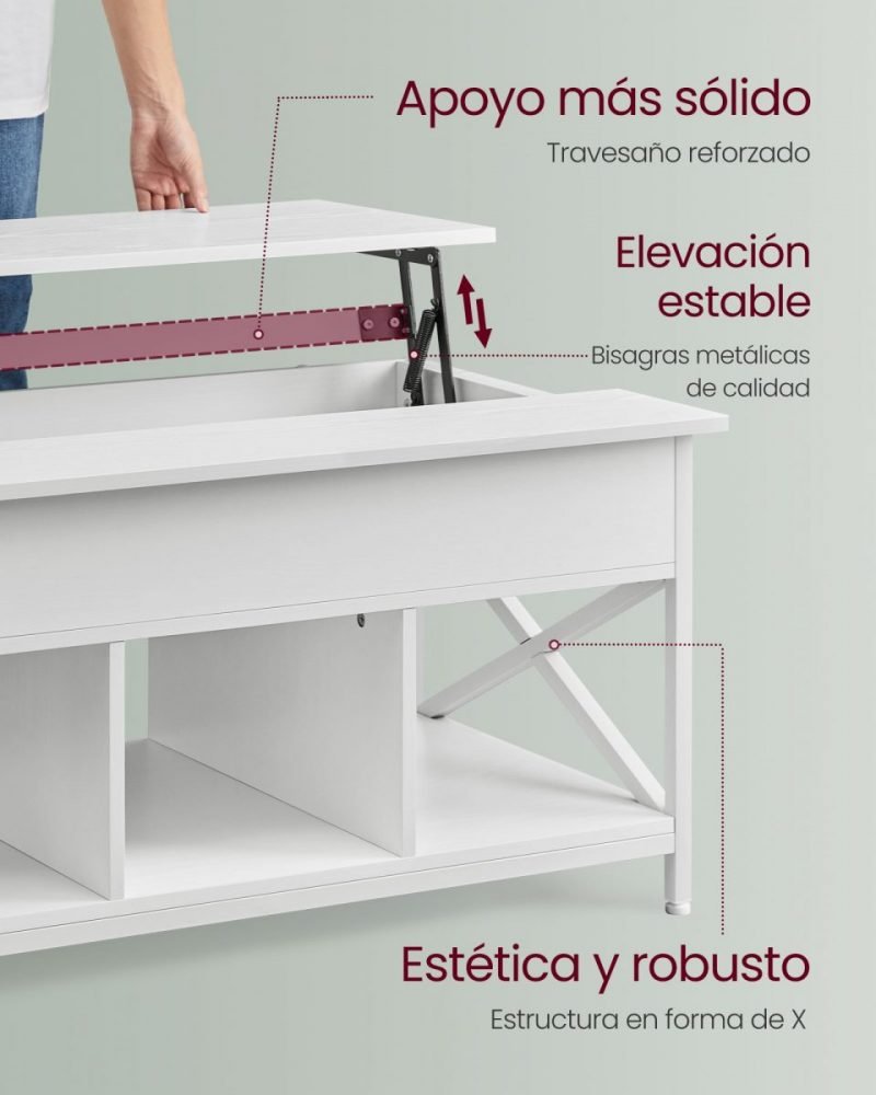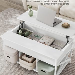 Nuestra mesa no solo ofrece una superficie elevable para tu comodidad, sino que también integra 3 compartimentos abiertos para mantener juegos de mesa, libros y manualidades al alcance de la mano. Además, el compartimento oculto bajo la tapa es ideal para almacenar aquellos objetos que prefieres mantener fuera de la vista de tus invitados, manteniendo así un ambiente ordenado y acogedor.