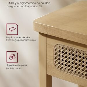 Estilo y Materiales: Un hermoso tono de Beige Roble combinado con MDF, aglomerado y ratán de PVC para un look natural.