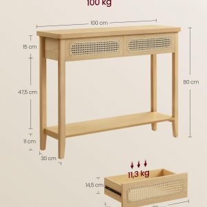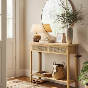 Dale a tu hogar un toque especial con esta mesa de consola que emana un encanto bohemio. Con su diseño inspirado en la naturaleza y detalles en ratán, es la pieza perfecta para añadir un aire fresco y orgánico a cualquier espacio.
