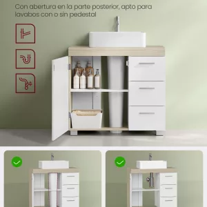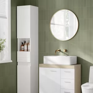 Armario de baño alto con cajones y estantes abiertos, blanco