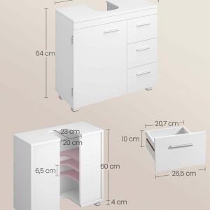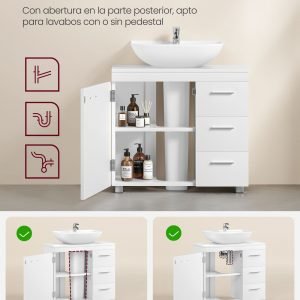 ¿Tienes un lavabo con pedestal o prefieres uno sin él? No importa tu elección, este mueble de baño se adapta a tus necesidades. Su diseño inteligente te permite integrarlo fácilmente en cualquier espacio, gracias a las dimensiones optimizadas de la abertura de la columna (30 x 70 x 64 cm) y del sifón (23 x 20 cm). Verifica estas medidas para asegurarte de que el mueble encaje perfectamente en tu baño.