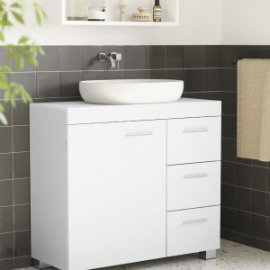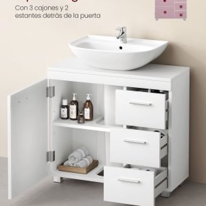 Diseñado pensando en tu comodidad, este mueble cuenta con tres espaciosos cajones laterales y dos compartimentos detrás de una puerta, proporcionando el espacio ideal para organizar todos tus accesorios de baño, toallas y productos de limpieza. Mantén todo en orden y a tu alcance, sin sacrificar la estética.