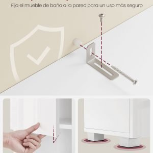 Nuestro armario de baño se destaca por su facilidad de montaje. Las piezas numeradas y las instrucciones comprensibles hacen que el proceso de ensamblaje sea un juego de niños. Además, los paneles lisos de las puertas son fáciles de limpiar, asegurando una durabilidad a largo plazo con poco esfuerzo.