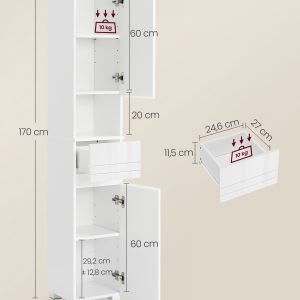 Experimenta la máxima organización con nuestro armario de baño meticulosamente diseñado, equipado con armarios superiores e inferiores, estantes y cajones. Con tres tipos de espacio y 6 compartimentos, este mueble ha sido creado para satisfacer diversas necesidades de almacenamiento, brindándote una solución integral para mantener tu baño impecablemente organizado.