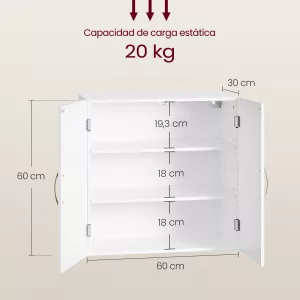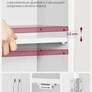 Amplio y Ajustable: Este mueble de baño ofrece un amplio espacio de almacenamiento con dos estantes ajustables, ideales para acomodar artículos de diferentes tamaños y formas. Desde productos de aseo hasta toallas y accesorios, todo encontrará su lugar.