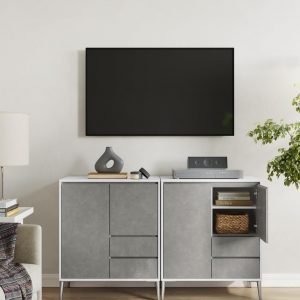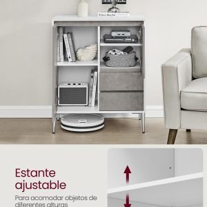 Con su diseño moderno y líneas limpias, este mueble ofrece un amplio espacio de almacenamiento, gracias a sus dos compartimentos con puertas, estantes ajustables, cajones y un estante adicional. Es una solución ideal para mantener tus artículos bien organizados y al alcance, ya sea en el salón, el comedor, el recibidor o el estudio.