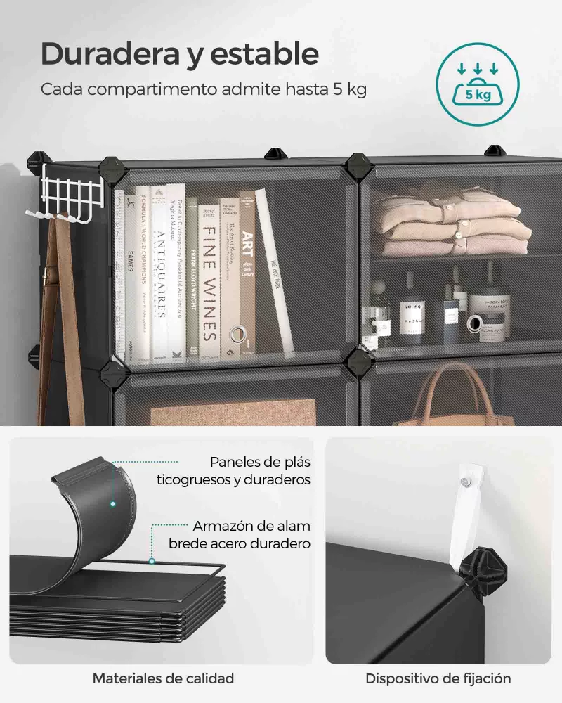 Robusto y Seguro: Fabricado con paneles de plástico de alta calidad y una estructura de alambre de acero, cada compartimento puede soportar hasta 5 kg. Incluye un kit antivuelco para asegurar su estabilidad en cualquier área de tu hogar, desde el salón hasta el dormitorio.