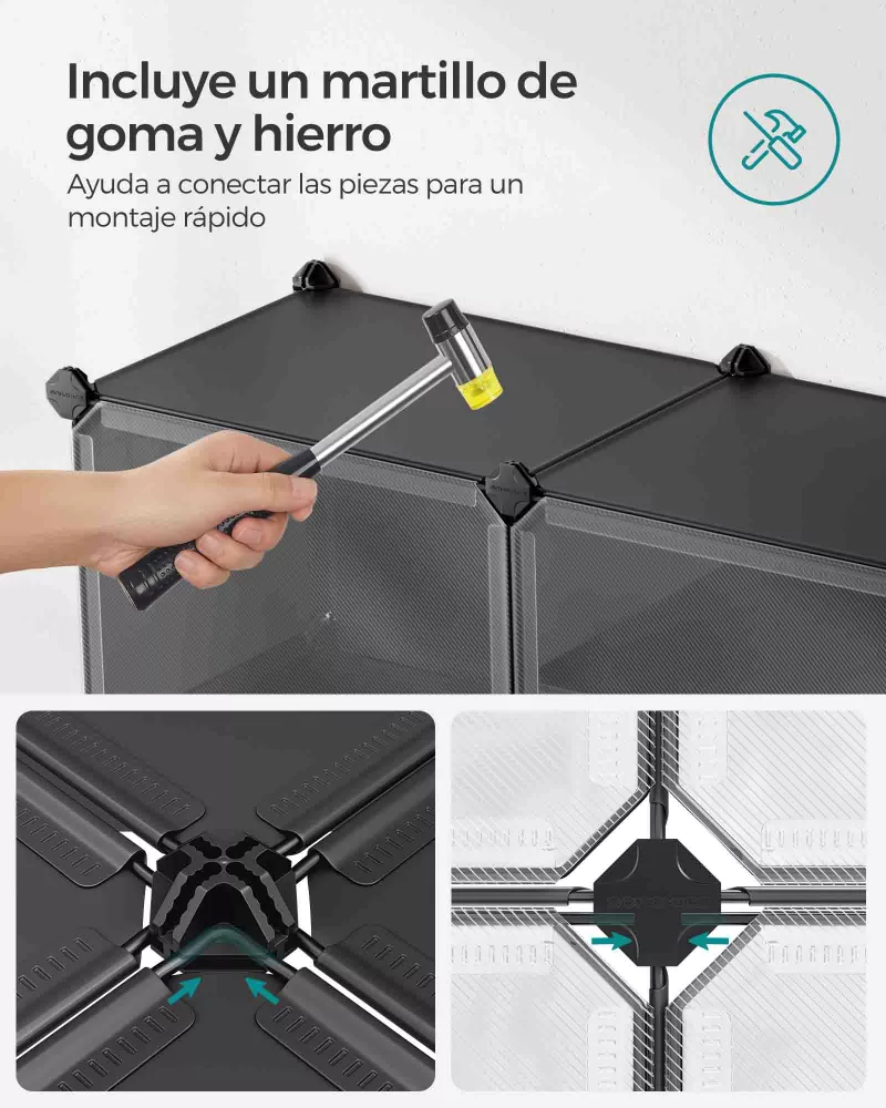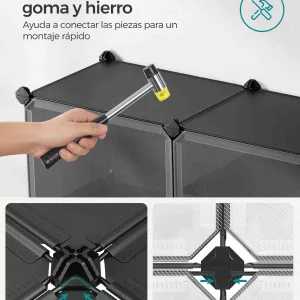 Montaje Sencillo: Con un mazo de goma y hierro incluido, puedes ensamblar esta estantería modular sin necesidad de herramientas adicionales. Su diseño permite un montaje y desmontaje fácil, ideal para guardarlo o transportarlo según sea necesario.