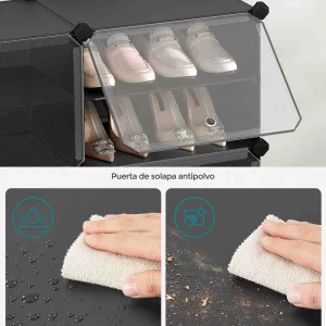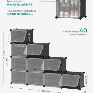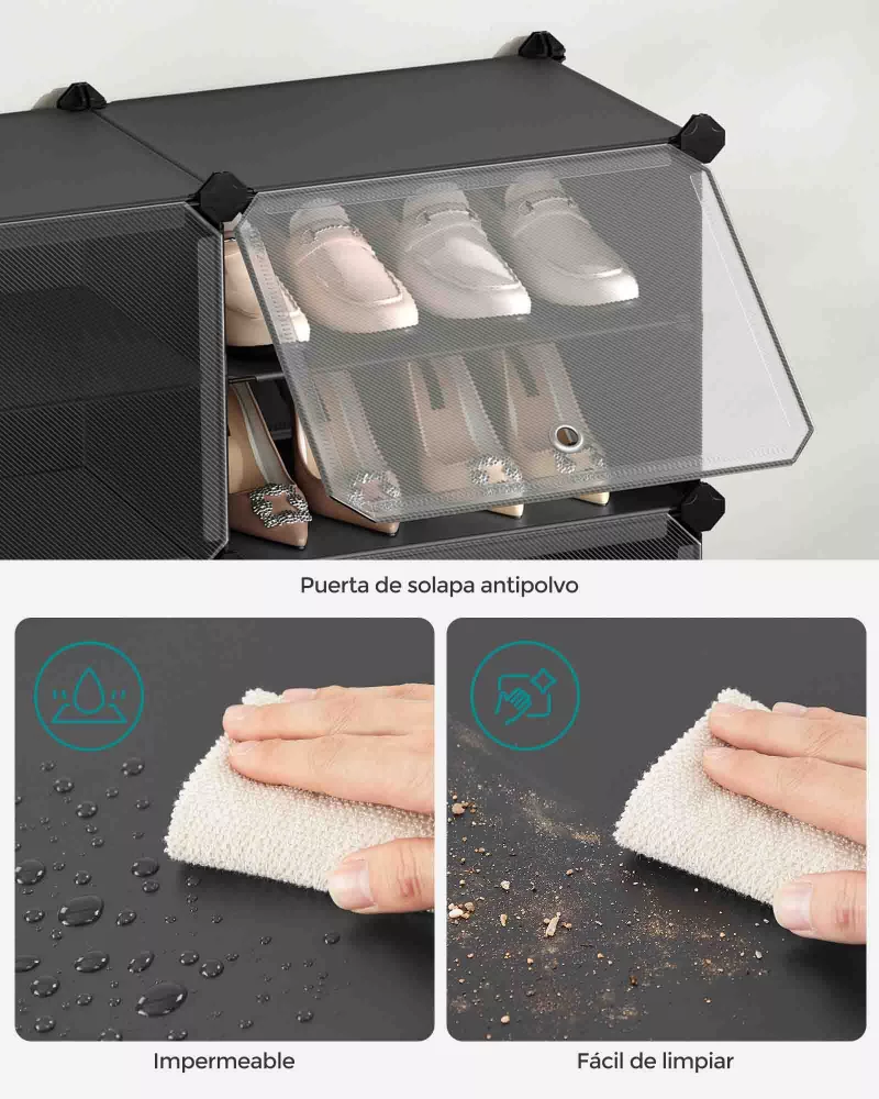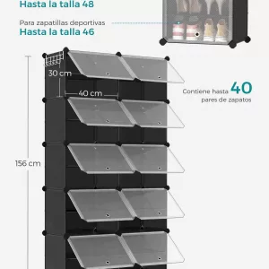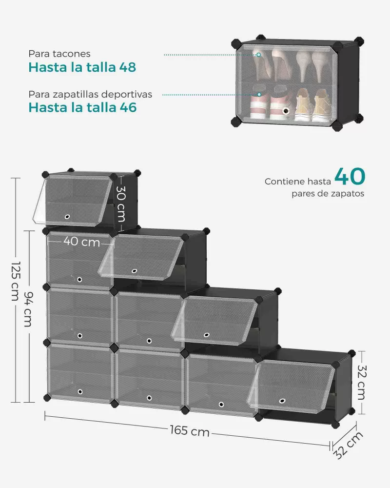 Diseñado para adaptarse a cualquier espacio, este mueble no solo almacena hasta 40 pares de zapatos sino que también ofrece soluciones versátiles para organizar bolsos, ropa y más. Su diseño robusto y seguro, junto con la facilidad de montaje y la flexibilidad de configuración, lo convierten en la solución perfecta para mantener tu hogar ordenado y elegante.