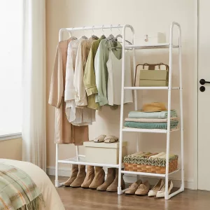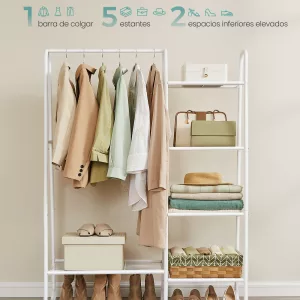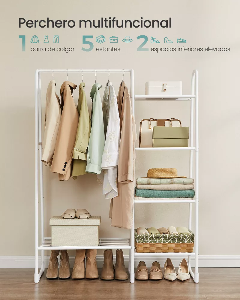 Perchero multifuncional: Integra un riel para abrigos y estantes de almacenamiento, permitiéndote organizar ropa, bolsos, accesorios y zapatos en un solo lugar, facilitando el acceso rápido a lo que necesitas.