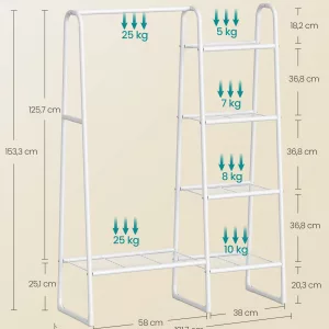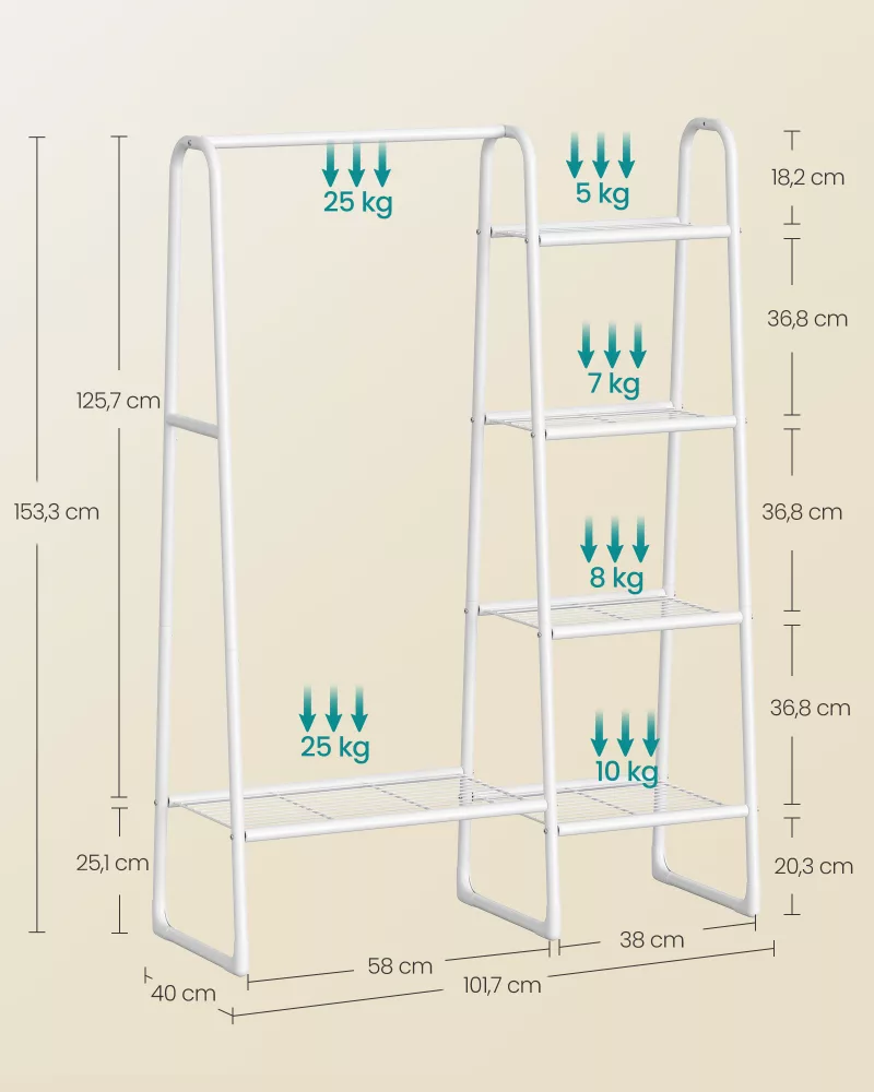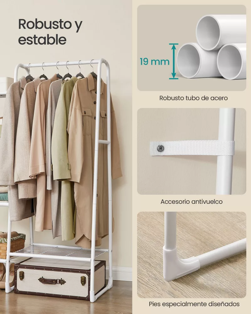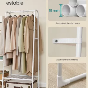 Robusto y resistente: Fabricado con acero de alta calidad, este perchero soporta hasta 25 kg en la barra de colgar y un total de 70 kg, asegurando que puedas colgar abrigos de invierno pesados de manera segura y sin preocupaciones.