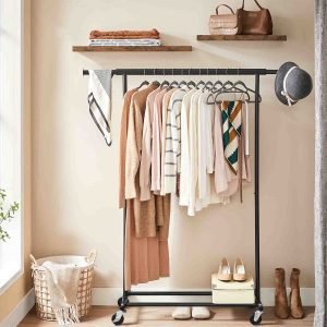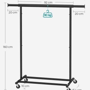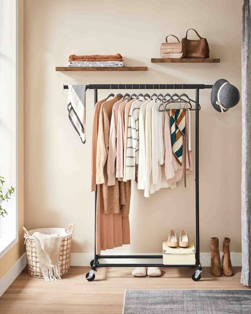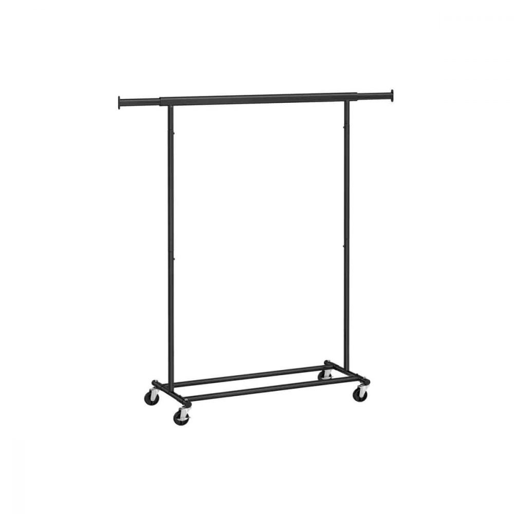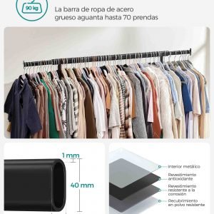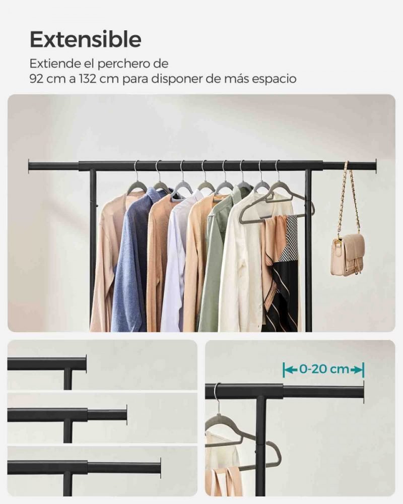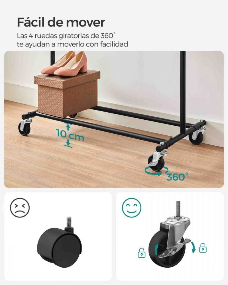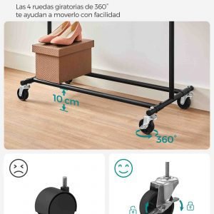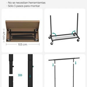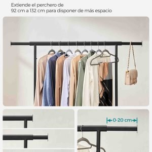 Perchero con ruedas, doble barra y estante para zapatos, negro