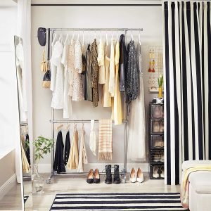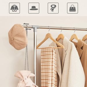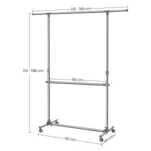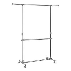 Perchero con barra ajustable y ruedas, color plata