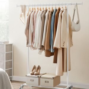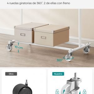 Fácil de Mover y Bloquear: Con 4 ruedas giratorias de 360°, dos de ellas con freno, este perchero es fácil de trasladar y estabilizar entre diferentes áreas como el dormitorio y el vestidor.