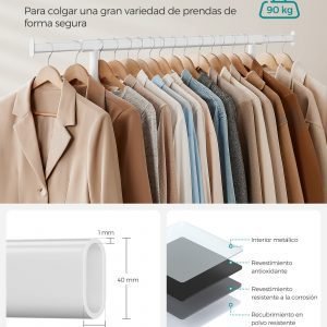 Capacidad de Carga Mejorada: Construido con tubos de acero de 1 mm de grosor y equipado con ruedas industriales de PP de alta resistencia, este perchero soporta hasta 90 kg, ideal para colgar abrigos y chaquetas pesadas con total seguridad.