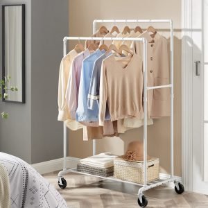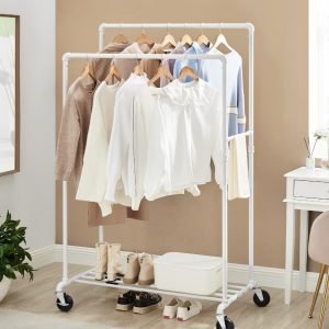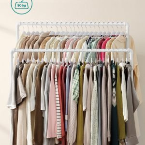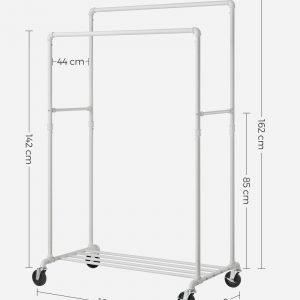 Dale a tu ropa el espacio que se merece con este perchero de doble barra, robusto y diseñado para cargar hasta 90 kg, gracias a su sólido marco de acero. Las ruedas resistentes hacen que moverlo sea un juego de niños, perfecto para adaptarse a cualquier espacio y necesidad.