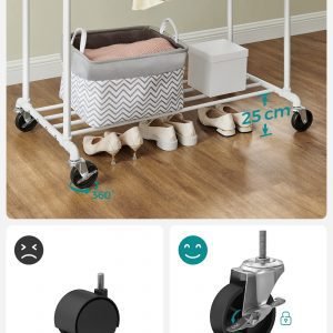 Movilidad Sencilla: Gracias a sus 4 ruedas universales, dos de ellas bloqueables, puedes mover el perchero a donde lo necesites, ya sea del dormitorio al armario o a cualquier otro lugar.