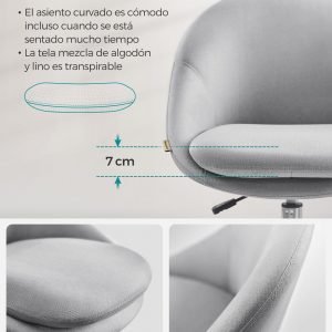 Esta silla giratoria no solo ofrece un diseño elegante y líneas geométricas sencillas, sino que también es versátil y funcional. Con la capacidad de girar 360° y ser ajustable en altura, esta silla es perfecta para trabajar, estudiar o maquillarte. Además, su diseño compacto ahorra espacio, facilitando su almacenamiento cuando no esté en uso.