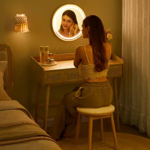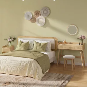 Este taburete de tocador de la colección aporta un toque de felicidad bohemia a tu espacio, creando un refugio perfecto para calmar tu mente y cuerpo. Con un diseño elegante y natural, sus patas de madera maciza y elementos tejidos se combinan para ofrecer una pieza funcional y decorativa que se adapta a cualquier ambiente de tu hogar. Ya sea en el dormitorio, sala de maquillaje o cualquier otro espacio, este taburete versátil se convierte en el complemento ideal para tu rutina diaria de belleza y organización.