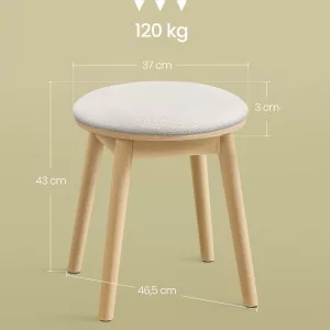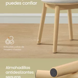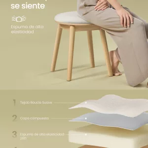 Construcción sólida, soporte fiable: Fabricado con robustas patas de madera maciza, este taburete redondo garantiza una estabilidad excepcional, soportando hasta 120 kg sin tambalearse, ofreciendo un lugar de descanso seguro para tu rutina de belleza.
